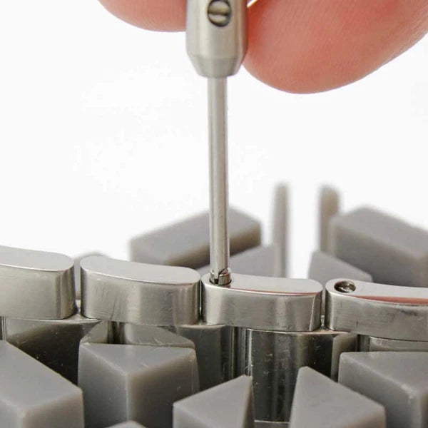 Individual T Blade flat head screwdriver feature a unique scoop-curve to form the ideal T-shaped blade that can fit bracelet link screws better than most other hollow ground and V shape blades. Stainless steel handle with ion plated knurled grip, hex heads on ball bearing and stainless steel blades. Includes 2 replacement blades.