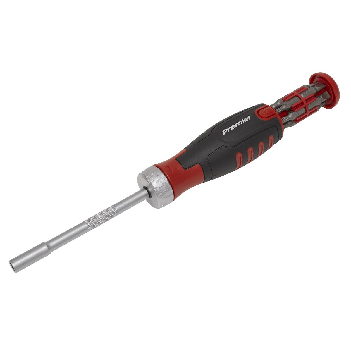 Twist-reverse and ratchet lock mechanism. Chrome Vanadium steel shaft with magnetic bit retention. Features spring loaded integral bit storage. Supplied with 12-piece S2 steel bit set.